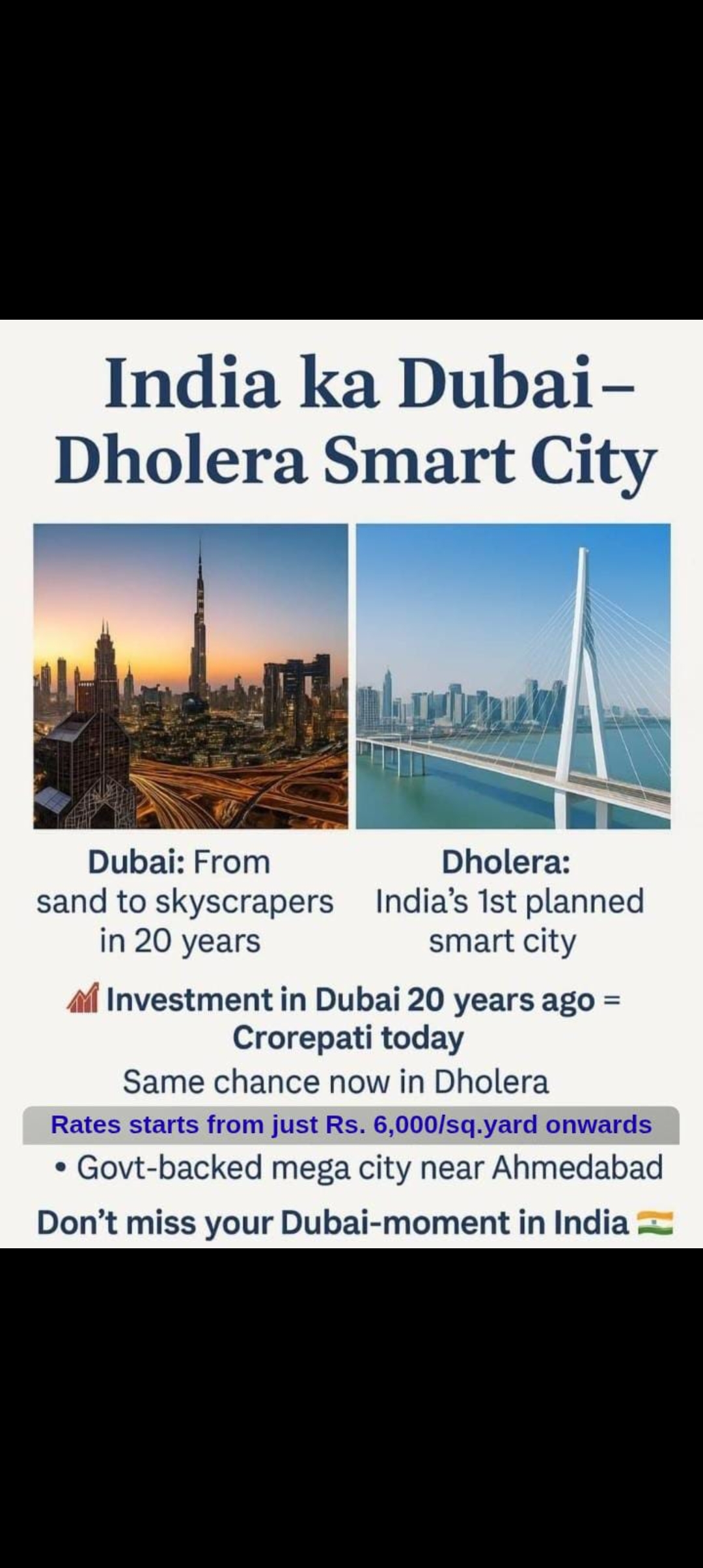 भारत के सबसे बड़े Real-Estate प्रोजेक्ट (Dholera Greenfield Smart City, Gujrat) में सुरक्षित निवेश करने के लिए आप सादर आमंत्रित है। यह हमारे प्रिय प्रधान मंत्री श्री नरेंद्र मोदी जी का Dream प्रोजेक्ट भी है।